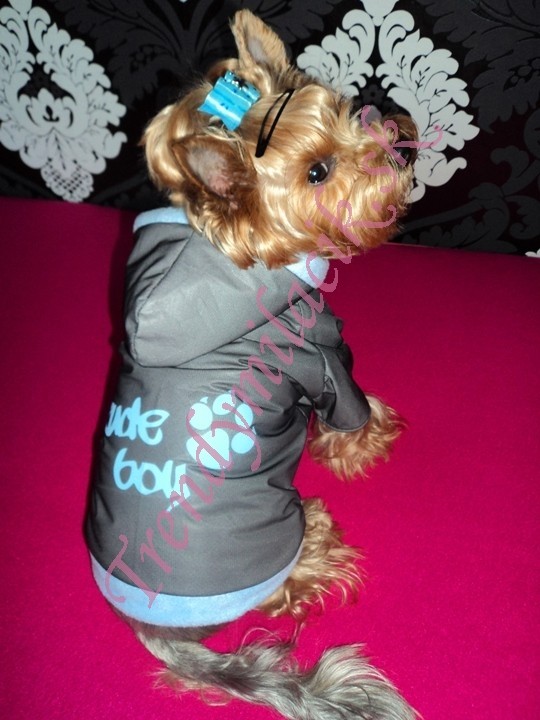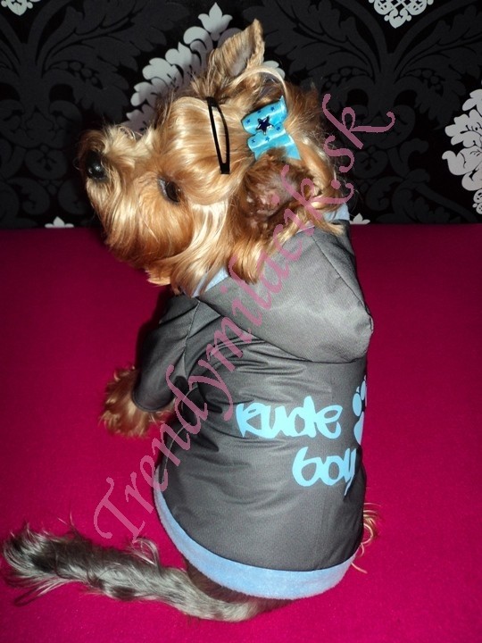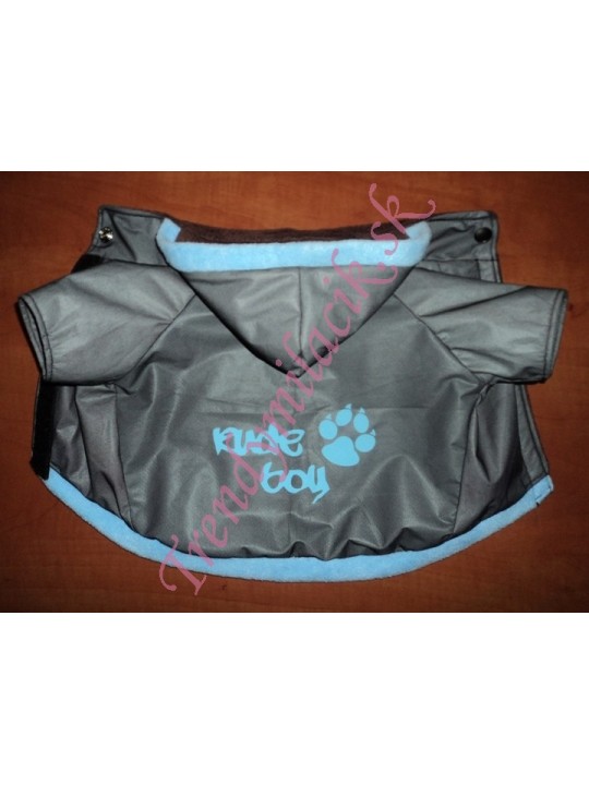 Bundička je pohodlná, nepremokavá podšitá príjemným materiálom. Farba bundičky je sivá. Chrbátik zdobí kvalitná potlač sv. modrej farby. Kapucňa a spodná časť je doplnená sv. modrým patentom.