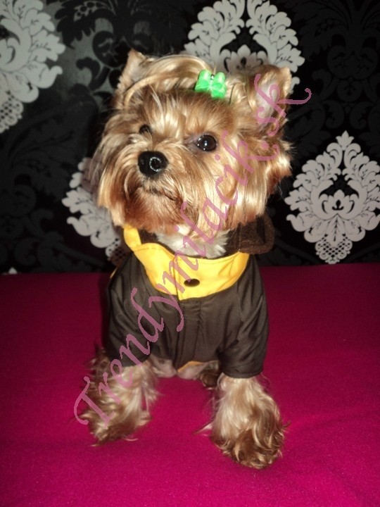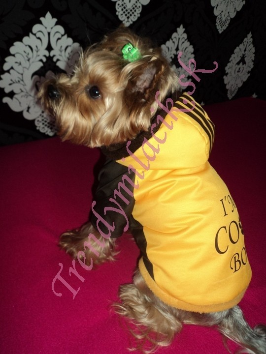 Táto originálna bundička je pohodlná, nepremokavá podšitá príjemným materiálom. Farba bundičky je sýta žltá komb. hnedou. Chrbátik zdobí kvalitná potlač hnedej farby. Kapucňa a spodná časť je doplnená patentom. Zapínanie je na suchý zips. Na požiadanie dávame aj cvoky +2 €.