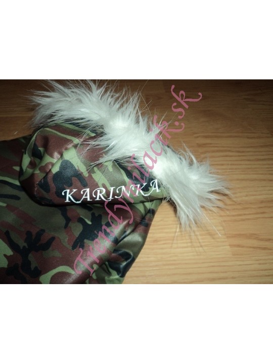 Nepremokavá a oteplená bundička v štýle "Army". Kapucňa je zdobená potlačou mena.