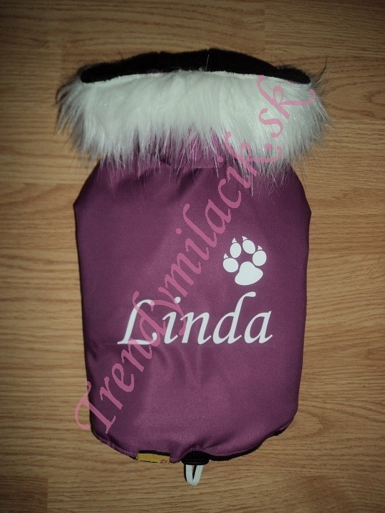 Nepremokavá a oteplená bundička. Chrbátik zdobí kvalitná potlač s menom psíka podľa vlastného výberu. Ak si prajete mať na kapucni kožušinku je potrebné vybrať túto možnosť kliknutím na doplnky.